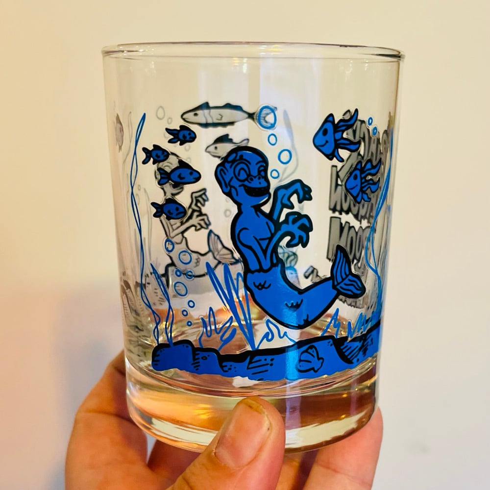 Our Black Lagoon Room Fiji Mermaid logo is printed in black and blue on this classic old fashioned cocktail glass, paying homage to that greatest of murky water dwelling fish men of yore, the Creature from the Black Lagoon! It comes to you ready to convey 14 full ounces of your favorite liquid directly to wherever you decide to pour it.